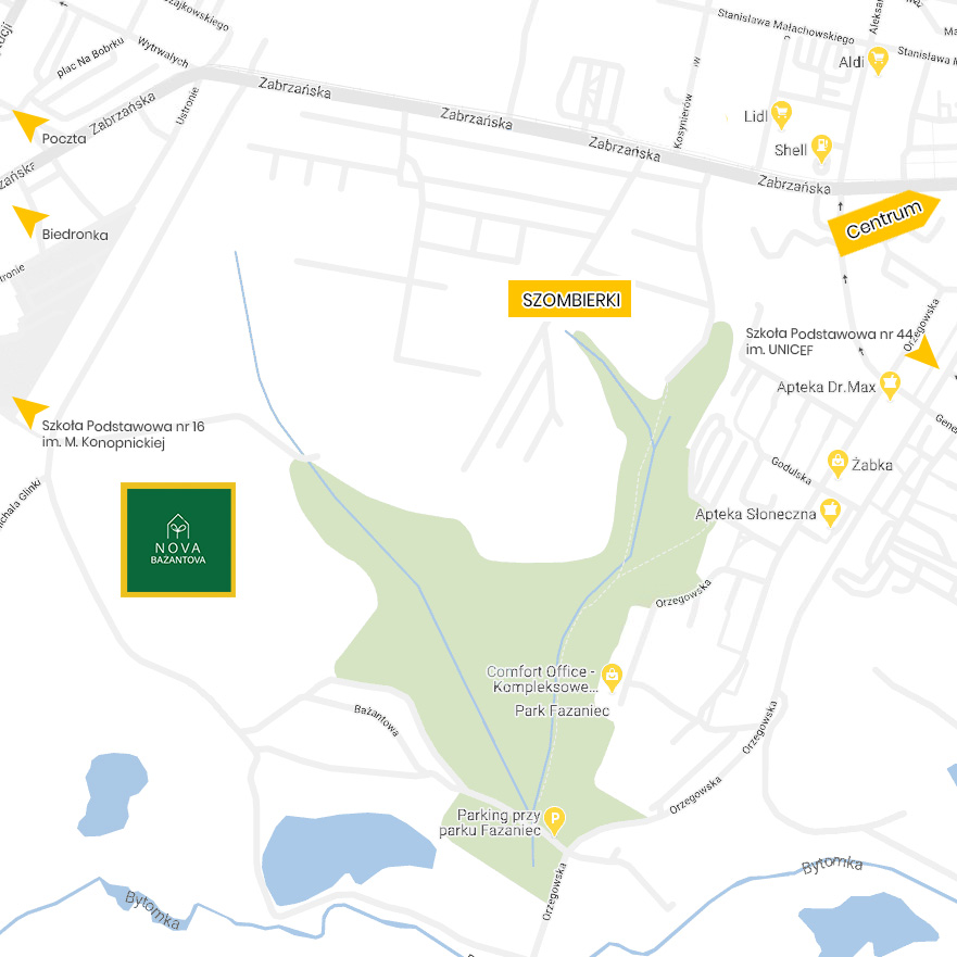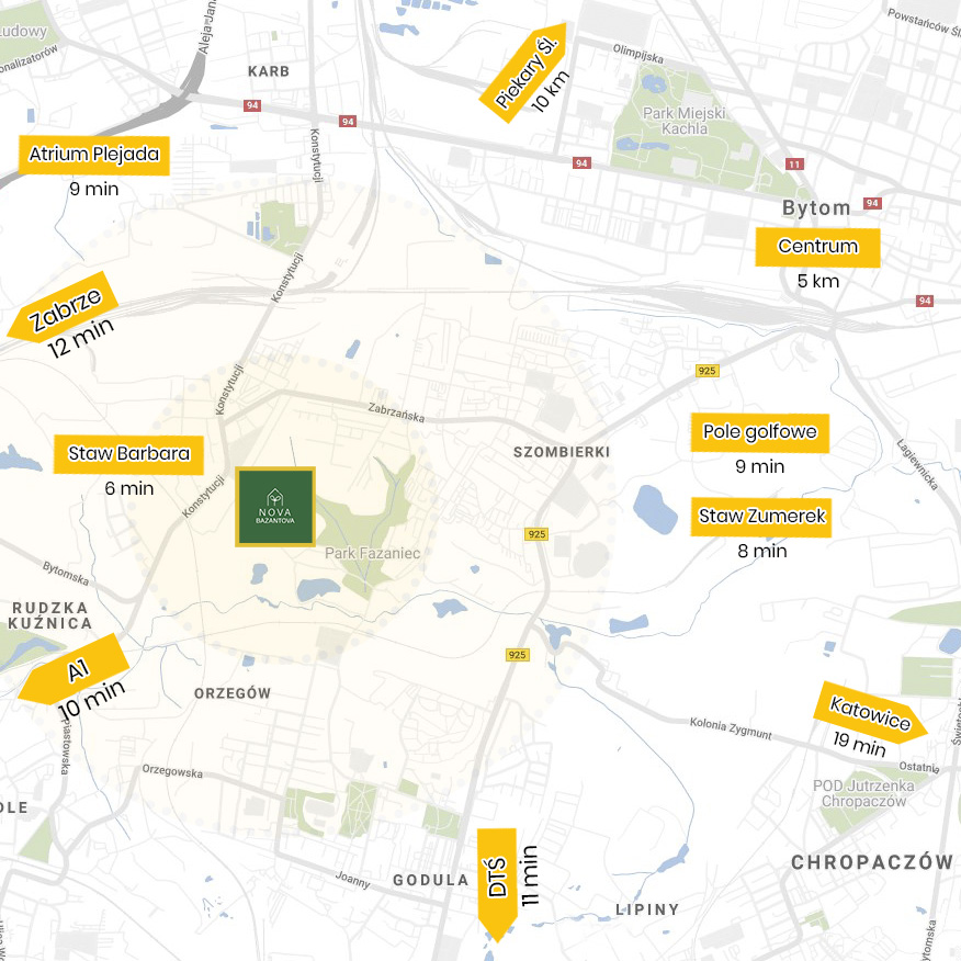 Osiedle Nova Bażantova znajduje się w wyjątkowo cichej, spokojnej i zielonej okolicy. W sąsiedztwie dzielnicy Szombierki w Bytomiu, oddalonej od centrum miasta o około 5 kilometrów. Inwestycja jest dobrze skomunikowana. Dzięki pobliskim przystankom autobusowym i tramwajowym szybko można dostać się do wielu punktów aglomeracji. Lokalizacja gwarantuje również wygodny dojazd do dużych śląskich miast, m.in.: Chorzowa, Zabrza, Rudy Śląskiej czy Katowic. W regionie nie brakuje miejsc umożliwiających aktywną rekreację, centrów handlowych, terenów zielonych i wielu atrakcji.